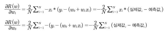독립변수가 1개인 단순 선형 회귀에서는 기울기 w1과 절편 w0를 회귀계수로 칭하빈다. (절편은 영어로 intercept)