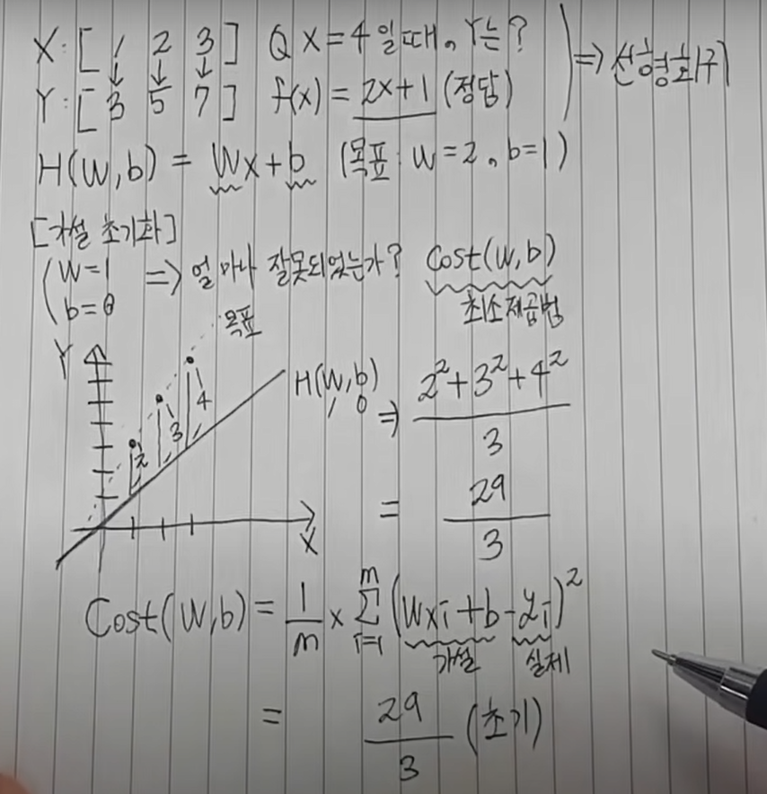 예시로 x = [1,2,3] 이라고 하고, y=[3,5,7]의 관측값이 있다고 했을때 우리는 f(x) = 2x+1 이라고 생각할 수 있다. 하지만, 기계는 이렇게 계산을 할 수 없다. 초기화된 값을 기준으로 점점 오류가 작아지는 방향으로 f(x)식을 완성해 갑니다.