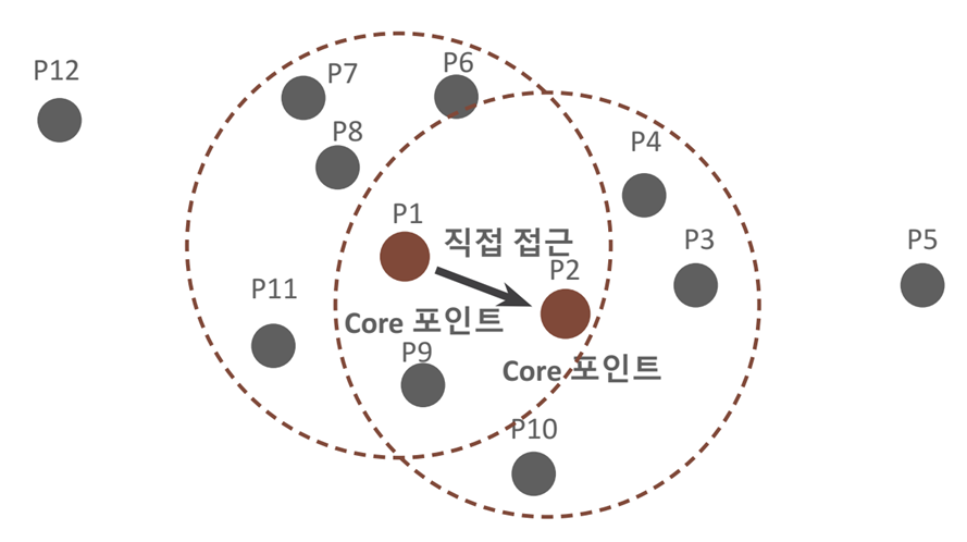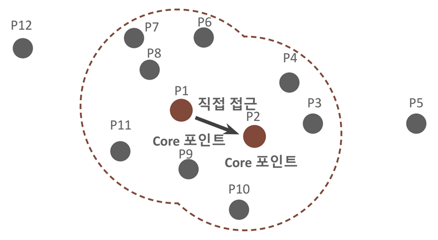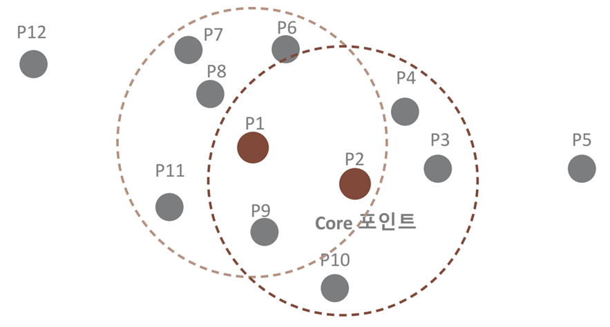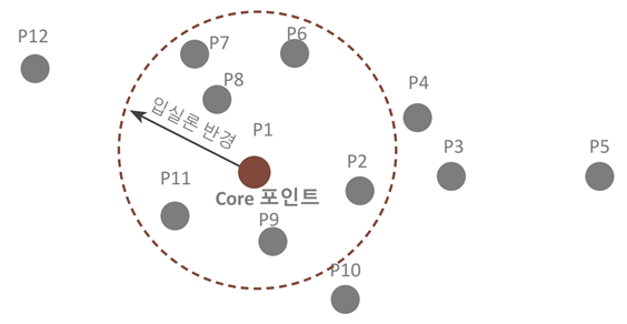 - 핵심 포인트(Core Point): 주변 영역 내에 최소 데이터 개수 이상의 타 데이터를 가지고 있을 경우
