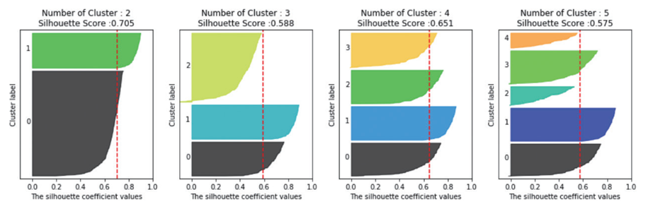 군집별 평균 실루엣 계수의 시각화를 수행하였다. 몇개의 군집이 적절할까?