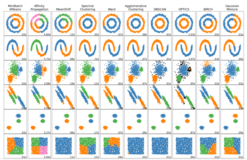 위의 그래프로 알 수 있듯이 데이터 분포에 따라 군집화가 잘 되는 알고리즘과 그렇지 않은 알고리즘이 있음을 알 수 있다.