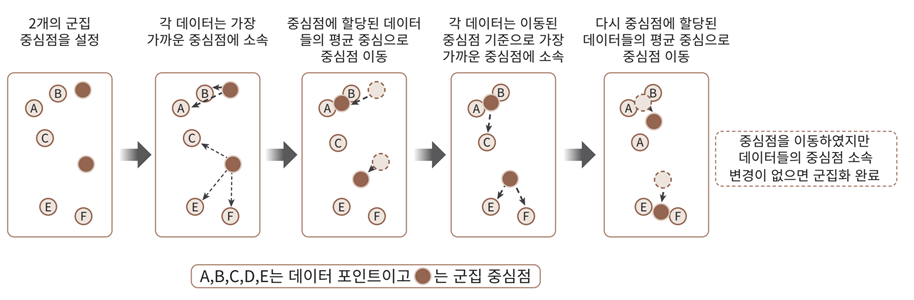 Step 6: 위 프로세스를 반복, 데이터의 중심점 변경이 없으면 반복 중단 및 군집화 종료