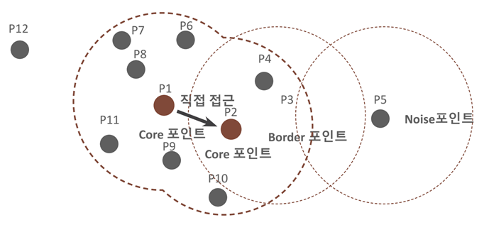 - 경계 포인트(Border Point): 주변 영역 내에 최소 데이터 개수 이상의 이웃 포인트를 가지고 있지 않지만, 핵심 포인트를 이웃 포인트로 가지고 있는 데이터(P3, P4, P6, P7, P8, P11, P9, P10)