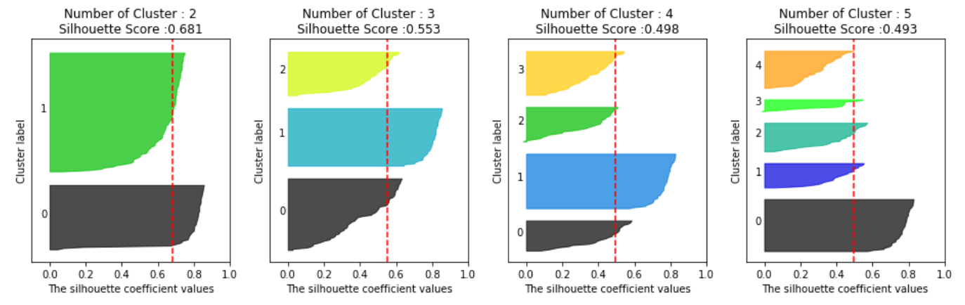 Cluster를 3개로 나눈 두번째를 보면, 2번 군집의 실루엣 계수가 마이너스(-)가 되었다. 2번 군집의 실루엣계수와 전체군집의 평균실루엣계수의 편차가 있음을 알 수 있다.