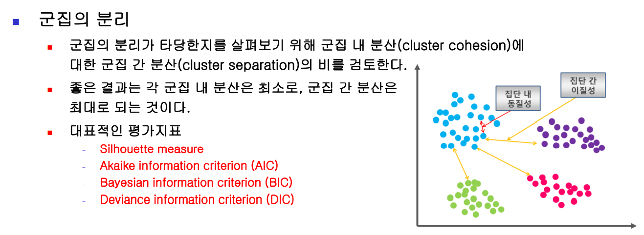 군집화는 정답이 없는 unsupervised-learning이다. 하여, 적절한 군집임을 평가 기준을 세우는 일이 어렵다.