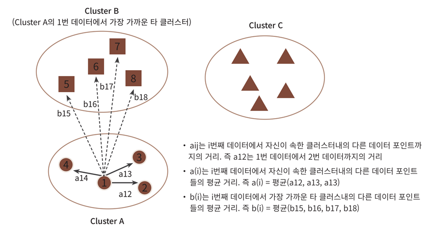 - 개별데이터가 가지는 실루엣 계수는 해당 데이터가 같은 군집 내의 데이터와 얼마나 가깝게 군집화돼 있고, 다른 군집에 있는 데이터와는 얼마나 멀리 분리돼 있는지 나타내는 지표이다.