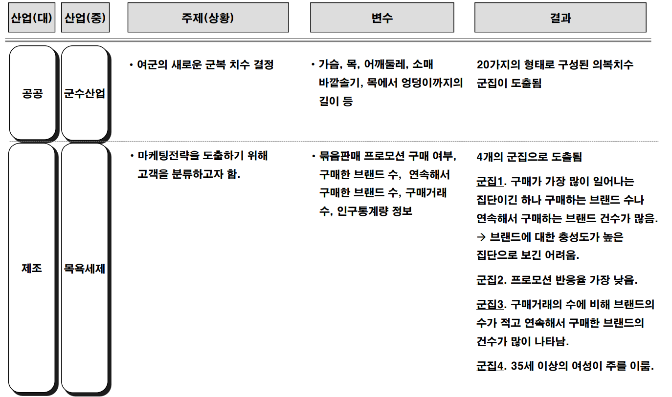 이와 같이 군집화는 특정 목적을 위해 군집의 유형을 나누고 -> 정의하고 -> 특징을 요약하여 -> 활용하게 된다.