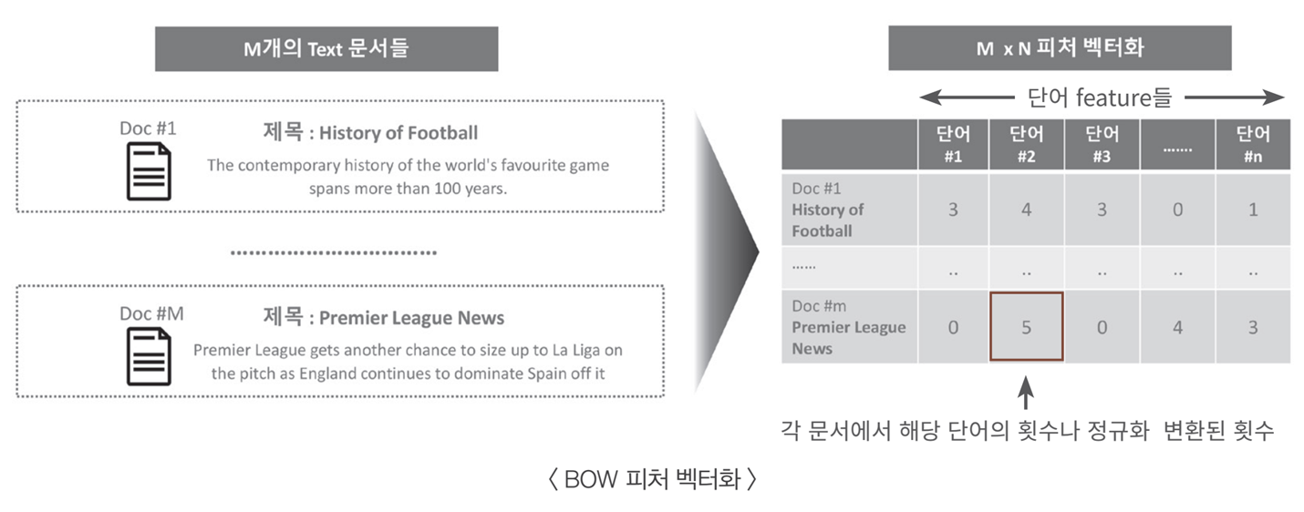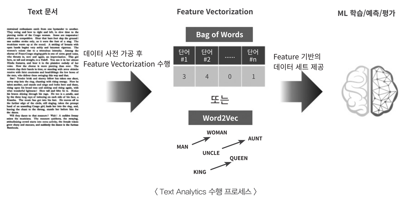 즉, "text문서 -> 가공(전처리) -> feature -> ml학습 -> 예측 -> 평가" 과정은 다른 ML 프로세스와 동일하다.