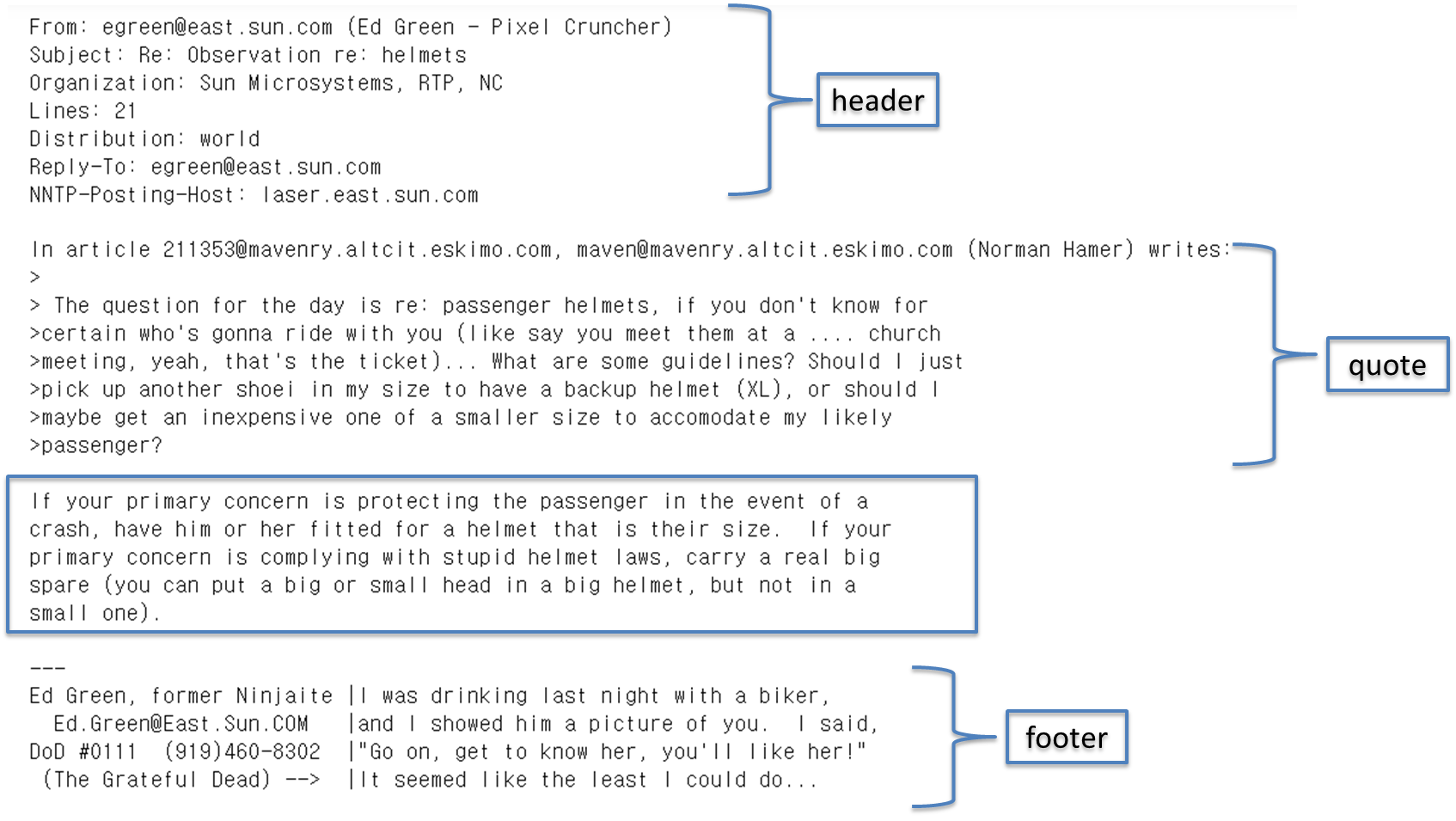 | 파라메터 - subset : 훈련(train)과 테스트(test)를 설정 - remove : 삭제하고 싶은 것을 tuple 형태로 설정 ('headers', 'footers', 'quotes'), telling it to remove headers, signature blocks, and quotation blocks respectively - categories : 분류하고자 하는 카테고리를 대입. 여기에서는 위에서 categories 로 정의한 변수를 대입합니다. |