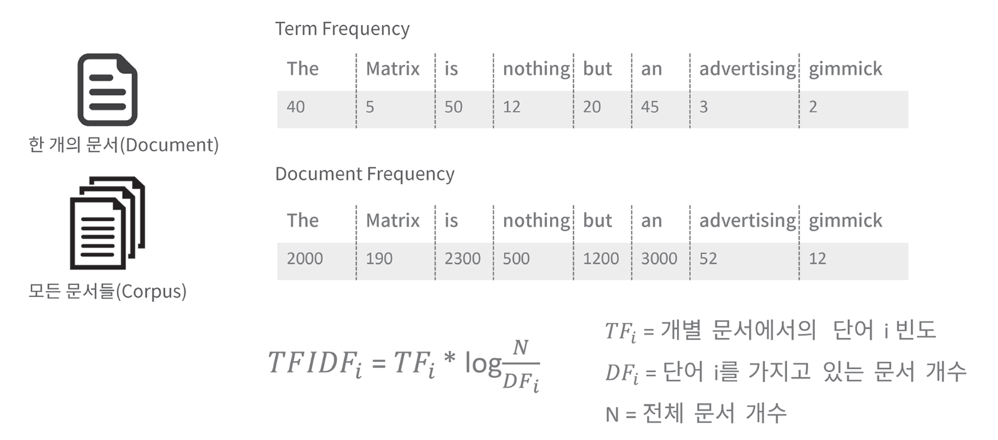 - DF : Document Frequency (DF가 클수록 다수 문서에 쓰이는 범용적인 단어)