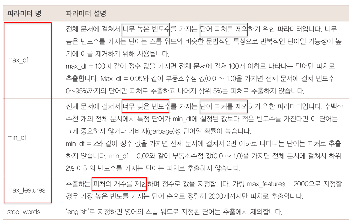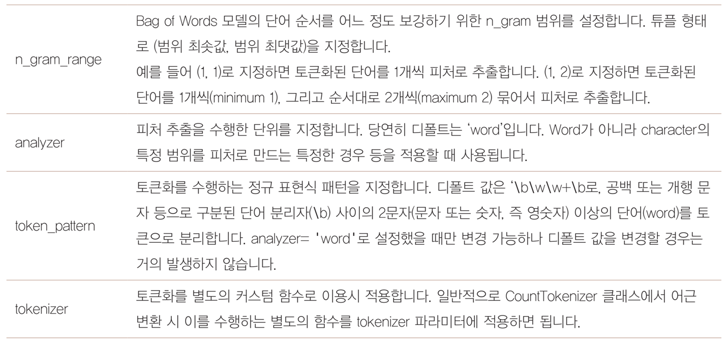 stop_words의 경우는 custom하게 만들 수도 있다. stop_words=['the','an','a'] 같이 파라메터를 전달하면, 해당 단어만 제외하고 추출한다.