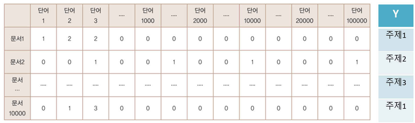 이번실습데이터로는 feature는 단어가 되고, target은 문서에 해당하는 주제가 된다.