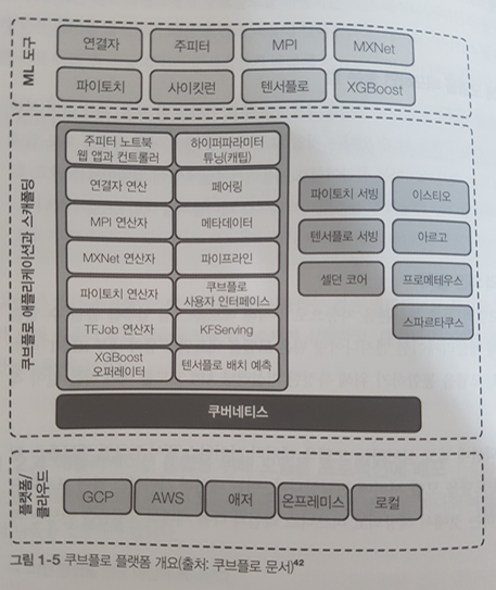 쿠브플로 플랫폼은 크게 3가지로 구성되어 있다. ML도구, 애플리케이션과 스캐폴딩, 플랫폼/클라우드로 말이다.