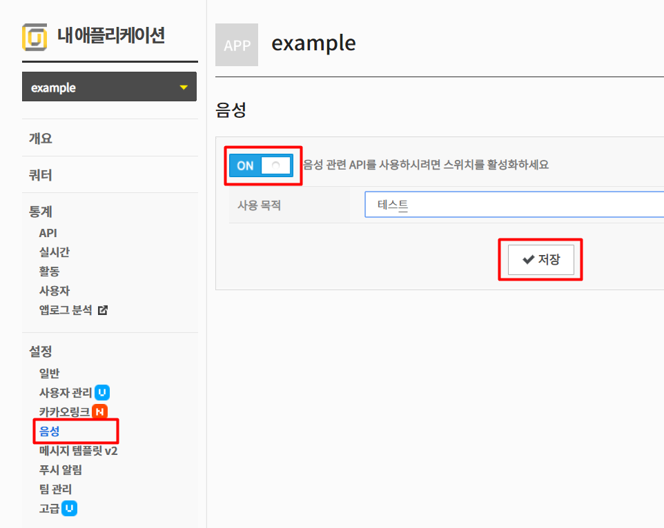 - 내 애플리케이션 > 설정 > 음성 > [ON] 으로 설정 변경