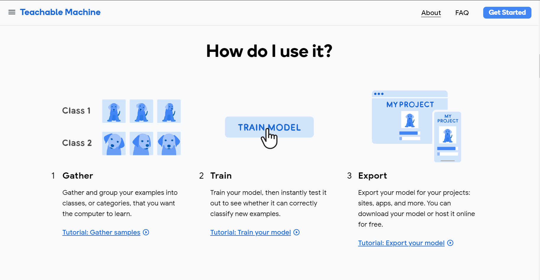 teachable machine을 사용하는 과정은 크게 세 부분으로 이루어집니다.