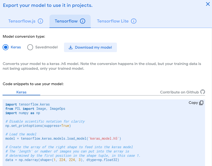 - 학습된 모델을 다양한 프로그램(Javascript, Java, Python)에서 사용할 수 있도록 내보내기 합니다.
