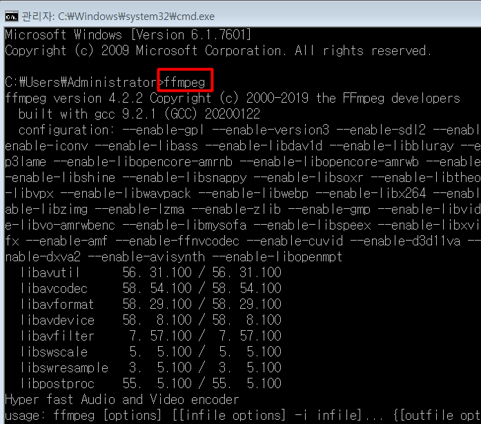 실행창에 ffmpeg 을 입력했을 때 다음과 같이 나왔다면, 성공!