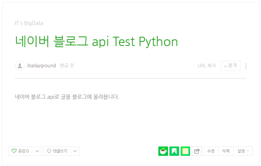 contents = urllib.parse.quote("네이버 블로그 api로 글을 블로그에 올려봅니다.")