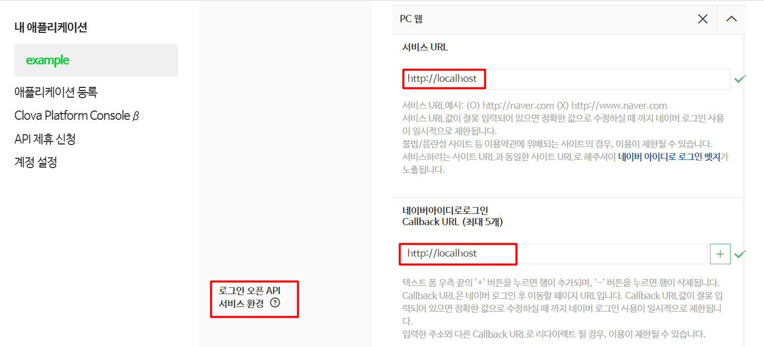 블로그의 경우 로그인이 필요하므로 서비스 url, callback url을 등록해야 한다.