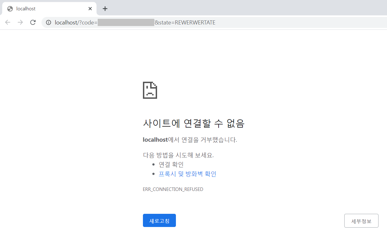 # 사이트에 연결할 수 없다고 나오면서 상단 URL에는 code와 state 값이 담겨 있습니다.