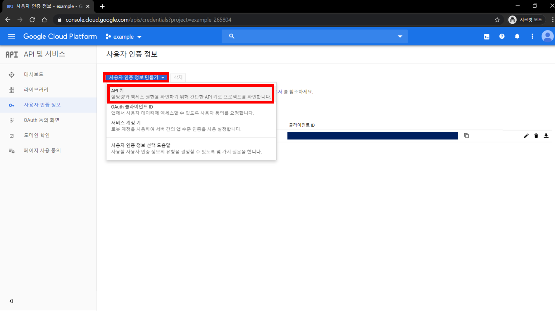 Step 5) 사용자 인증 정보 얻기 ('API 키' 방식)