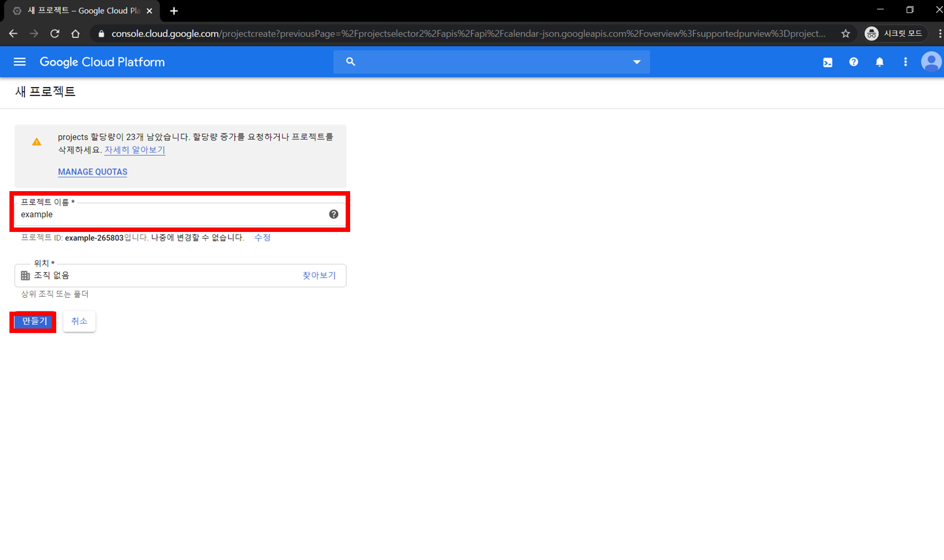 Step 2-2) [프로젝트 이름]을 입력하고, [만들기] 버튼 클릭