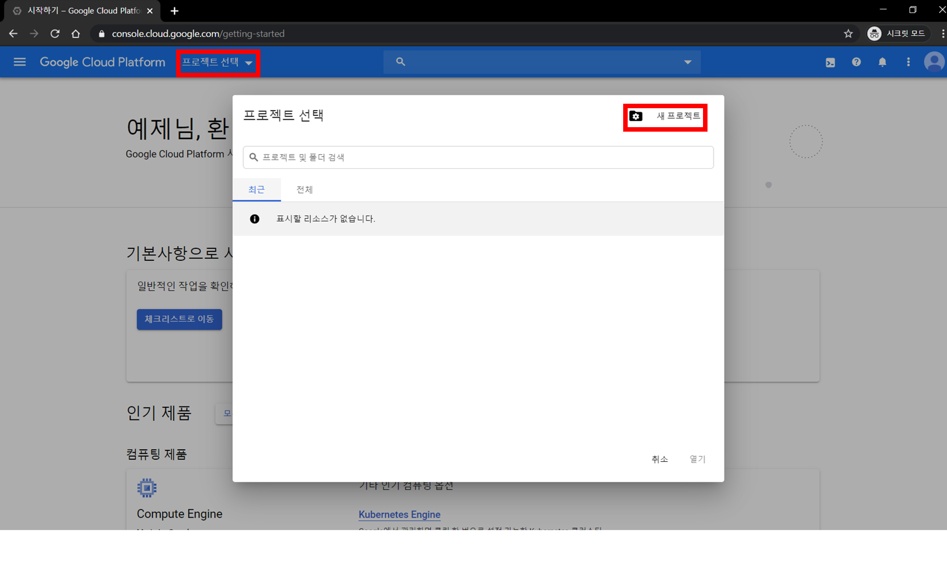 Step 2-1) 상단 [프로젝트 선택]을 선택한 후, [새 프로젝트] 클릭
