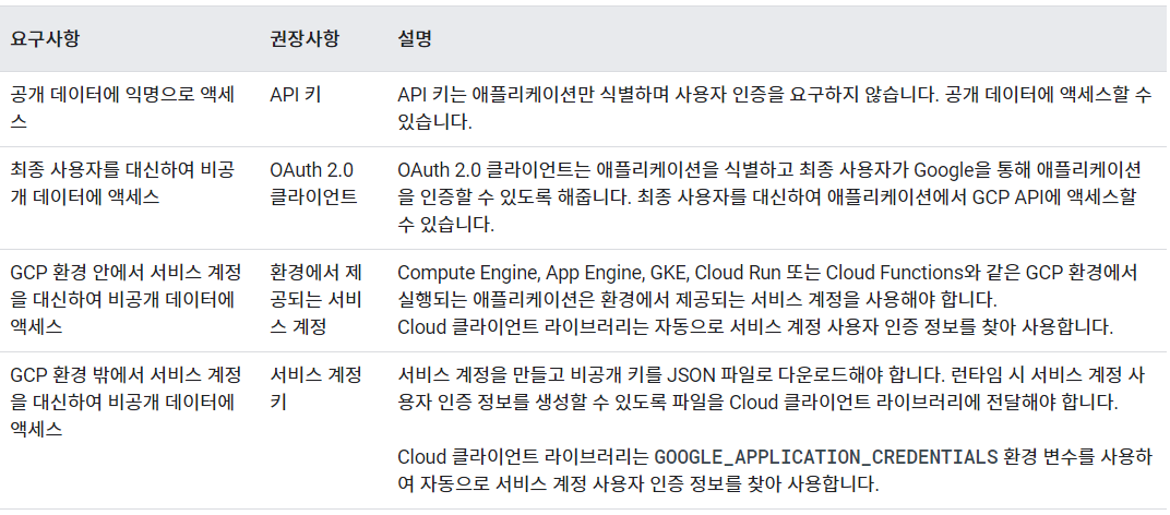 구글 서비스 API도 역시 다양한 방식으로 인증을 진행할 수 있는데요.