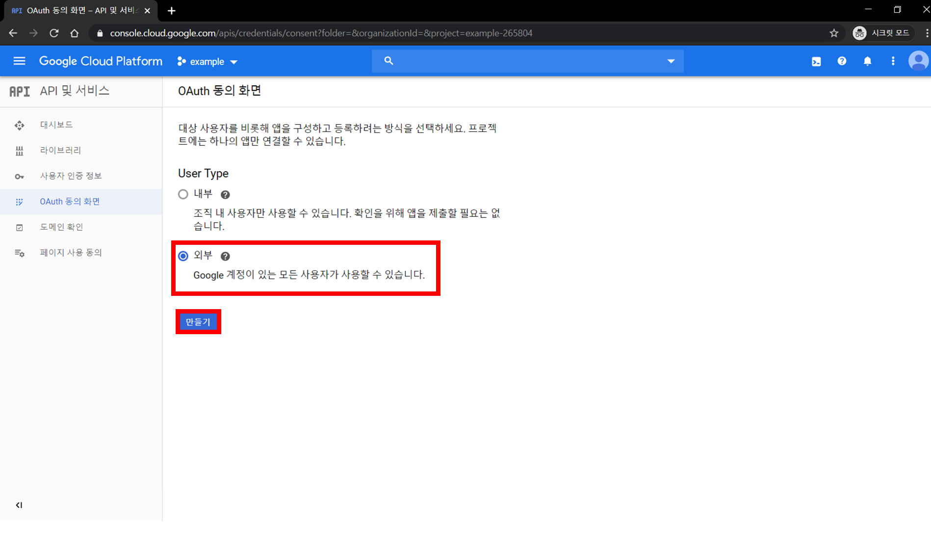 Step 3-2) [외부] 선택 > [만들기] 클릭
