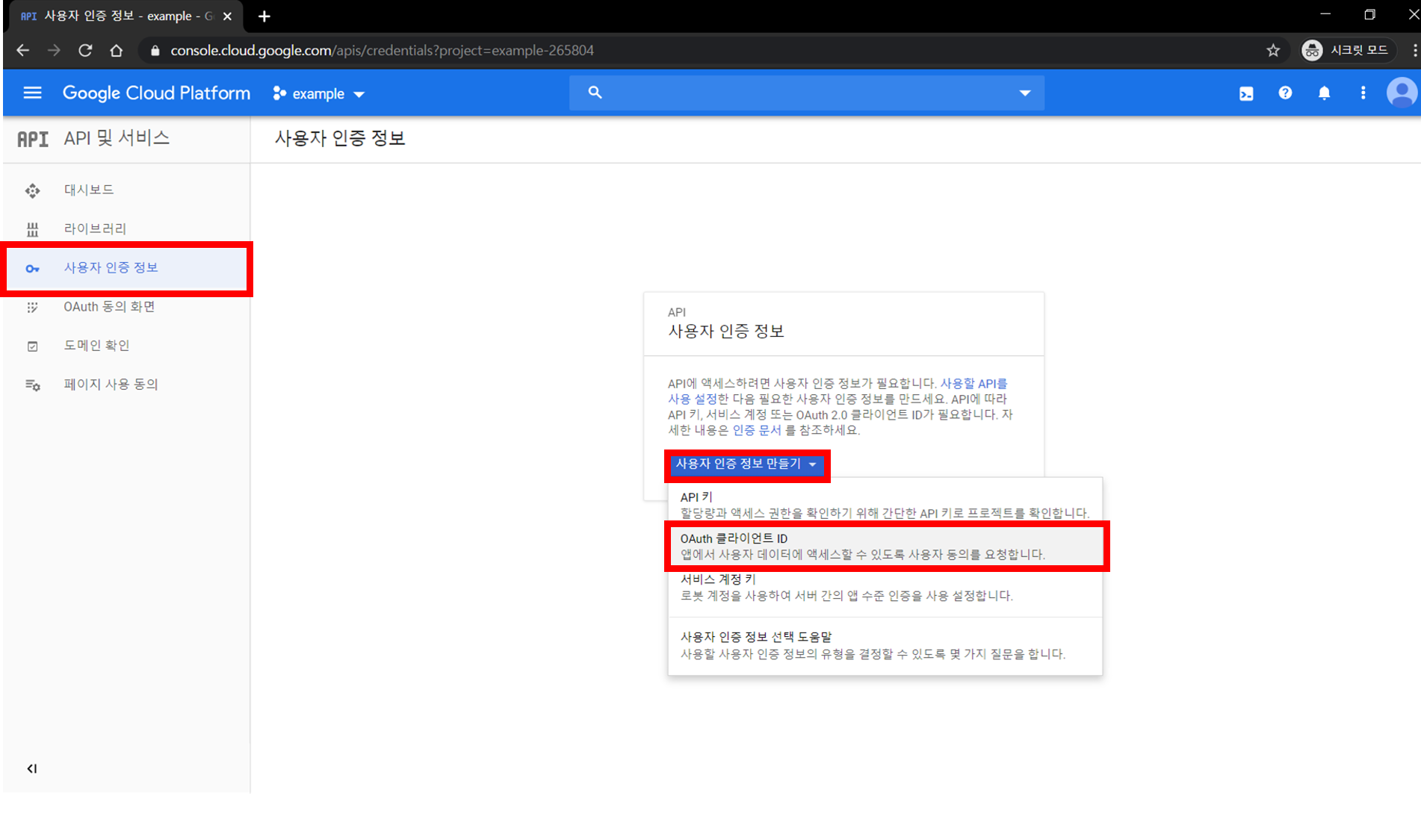 여기서 우리가 주로 사용할 구글의 인증 방식은 'OAuth 클라이언트 ID' 방식 입니다.