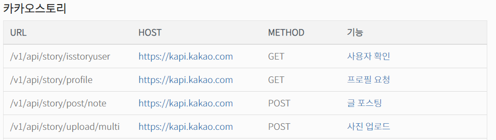 카카오스토리API의 경우를 예시로 보면, METHOD란에 기재되어 있음을 알 수 있다.