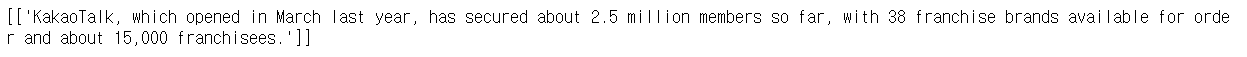 "query" : "지난해 3월 오픈한 카카오톡 주문하기는 현재까지 약 250만명의 회원을 확보했으며, 주문 가능한 프랜차이즈 브랜드는 38개, 가맹점수는 약 1만 5천여곳에 달한다." }