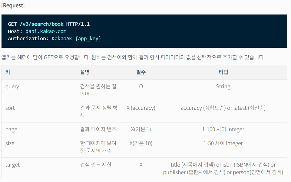 카카오 책 검색 OpenAPI를 예로 들어보면 다음과 같습니다.