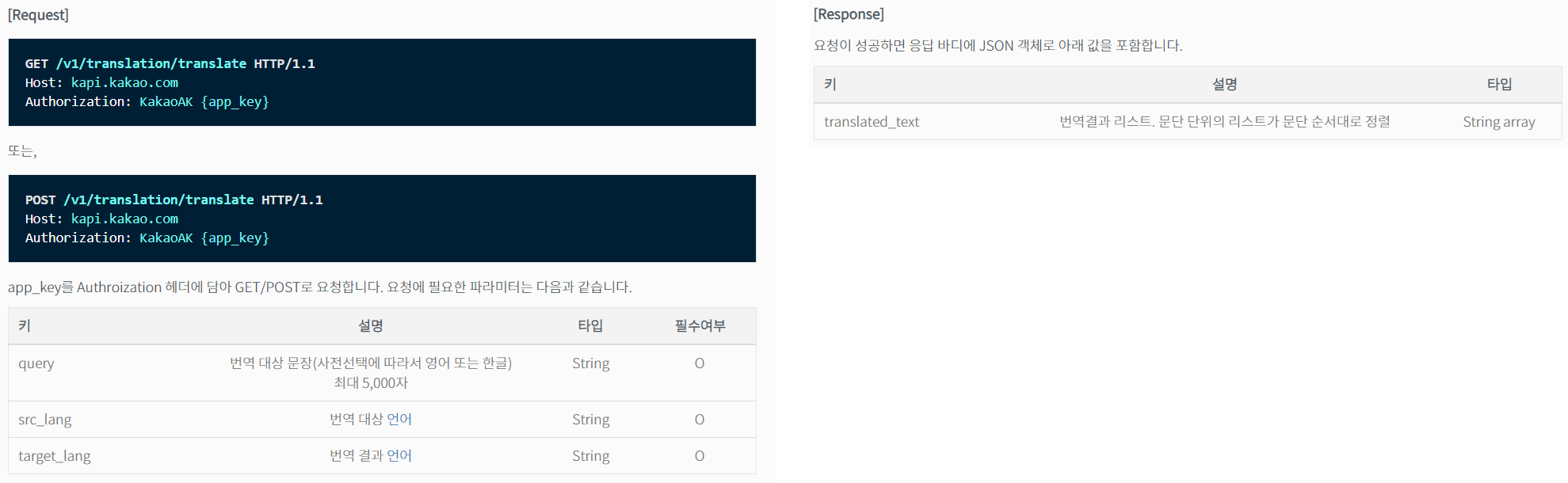 [Request] - HOST + GET 은 어디로 요청을 보내야 하는지에 대한 주소를 의미 - 앱키는 헤더(header)에 담아 - GET 또는 POST로 요청, 파라메터는 query / src_lang / target_lang가 필수 |