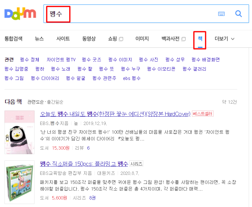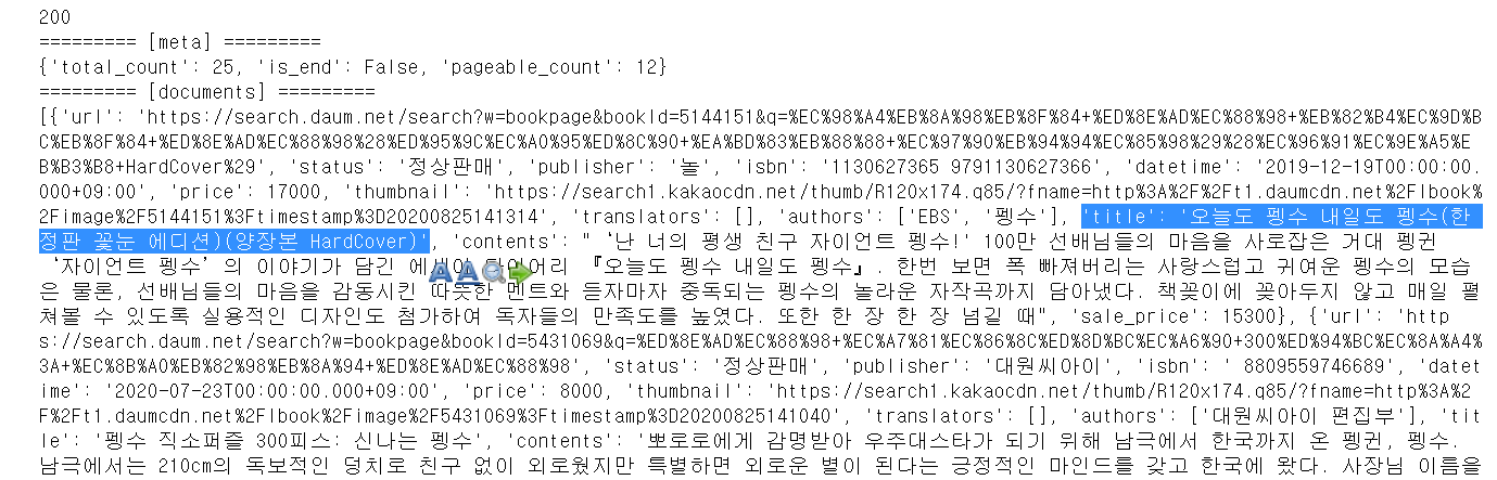 그리고 검정 블록에 결과값이 보입니다. 펭수와 관련한 책이 "오늘도 펭수 내일도 펭수(한정판 꽃눈 에디션)" 이라는게 있네요.