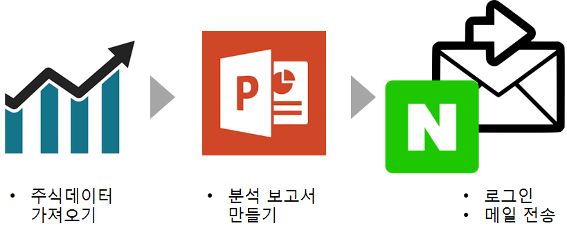그래서 이런 불편점을 해소가 위해서 주식정보를 받아 분석 보고서를 만들고, 이메일로 전송해주면 어떨까? 하는 생각이들었습니다. 이번 프로젝트는 주식 일별 시세 정보를 보고서로 만들어서 이메일로 전송해 주는 주식 분석 보고서 자동화 프로젝트를 준비했습니다.