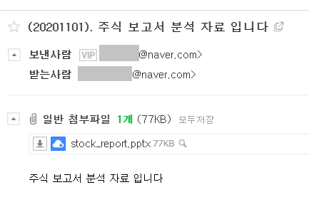 전송된 이메일입니다. 주식 분석 보고서 (stock_report.pptx)가 잘 첨부되어 있습니다.
